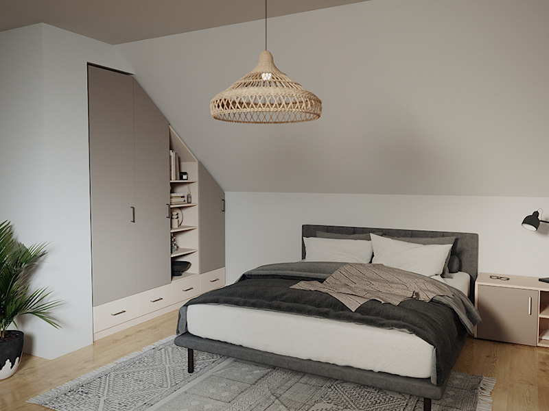 - Nutze den Platz in Nischen und unter Dachschrägen aus: Ein weißer Einbauschrank oder Drempelschrank unter der Schräge füllen dunkle Ecken und gleichen die einengende Wirkung von Schrägen aus.