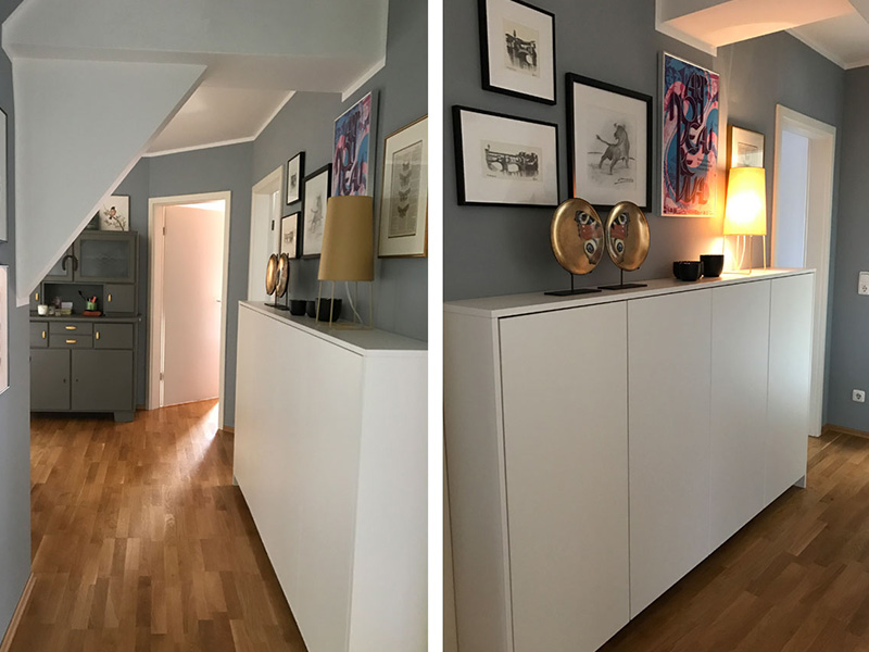 Um dennoch genug Stauraum zu schaffen, kannst Du die Kommoden etwas höher planen, sogenannte Highboards.