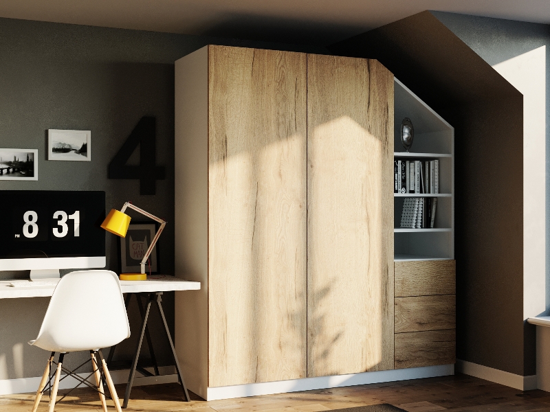 Ein Drempelschrank ist die perfekte Lösung für den Platz am Kniestock. Der Kniestock (auch Drempel genannt) ist die Wand zwischen Boden und Schräge. Große Schränke und Regale finden hier keinen Platz. Dennoch kannst Du diesen mit den passenden Möbeln nutzen: Bei einem Drempelschrank befindet sich die Schräge hinten. Die Rückseite verläuft also entlang des Kniestocks und der Dachschräge. Alles, was Du bei der Konfiguration brauchst, ist die Höhe des Kniestocks und der oberen Breite. Nach eigenen Bedürfnissen und Wünschen kannst Du den Drempelschrank mit Schranktüren, offenen Fächern und Schubladen ausstatten – ein individuelles System, zugeschnitten auf Deinen Job.