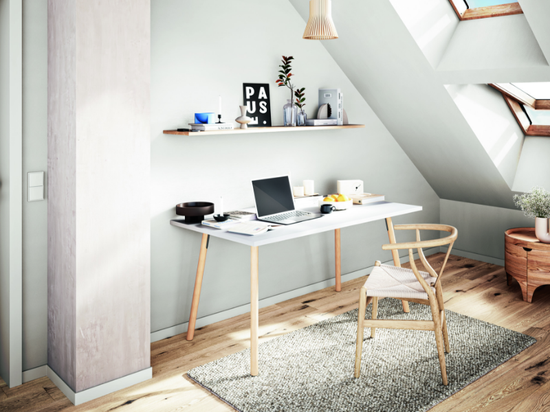 Richte dementsprechend Deinen Schreibtisch aus. Das Licht sollte direkt von oben oder seitlich auf den Schreibtisch fallen. Von vorn würde es im Zweifelsfall blenden, von hinten spiegelt es sich auf dem Bildschirm des Computers oder Du wirfst einen Schatten auf den Monitor. Sollte sich Dein Home-Office in einem ausgebauten Dachstuhl befinden, in dem nur kleine Dachluken vorhanden sind, dann greif am besten auf eine Tageslichtlampe zurück.