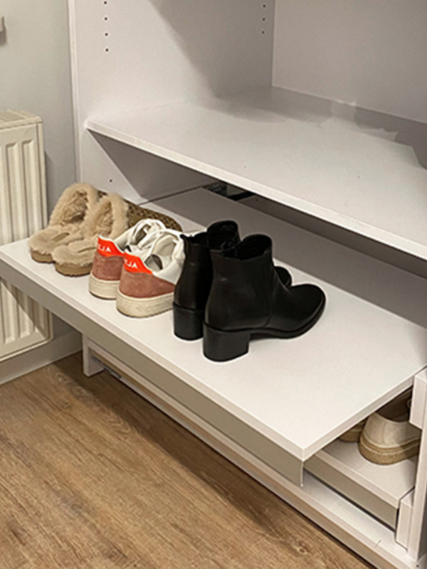 Die Planung von Sarah K. wurde dann in unserem 3D-Konfigurator umgesetzt. Unser Kundenservice stand auch hier wie immer mit Rat und Tat zur Seite. Zusammen mit Frau K. wurde die Planung auf Plausibilität und Optimierungsmöglichkeiten geprüft. Eine Besonderheit bei der Planung waren beispielsweise die Tablarauszüge, die zum Zeitpunkt der Planung sogar noch in der Entwicklung waren. Inzwischen wurden diese aber auch bei unserer Kundin eingebaut. „Für Schuhe sehr praktisch“ so Frau K.