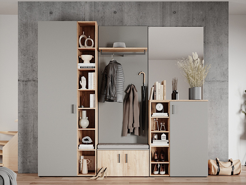 Links ein Garderobenpaneel mit Sitzbank und Hutablage, rechts ein Garderobenschrank für Jacken und Mäntel. Das Tolle an individuellen Sets ist, dass Du diese nach Belieben zusammenstellen und arrangieren kannst. In die Mitte passt dann z. B. ein Garderobenspiegel im Ganzkörper-Format. Das Beispiel Garderoben Set Lugo bietet den kompletten Komfort, den Du brauchst, bevor Du das Haus verlässt. Die aufeinander abgestimmten Farbtöne betonen eine moderne und vielseitige Optik, die sich problemlos mit weiteren Accessoires ergänzen lässt. Helles Grau und helle Holz-Dekore sind absolut zeitlos.