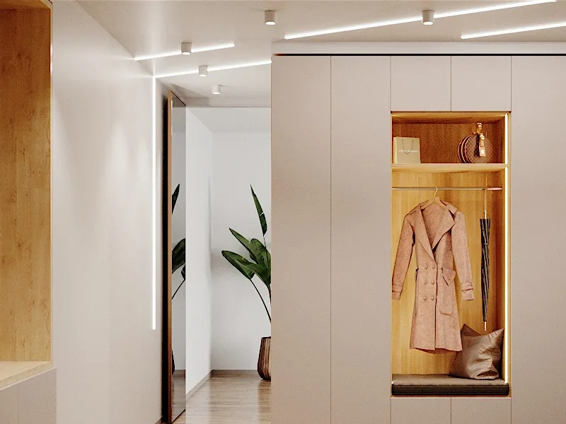 In einem breiten Flur ist ein Garderobenschrank mit Spiegel immer eine gute Idee. So kannst Du direkt Deinen Look prüfen, bevor es raus ins Freie geht.