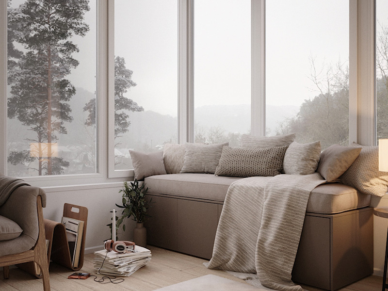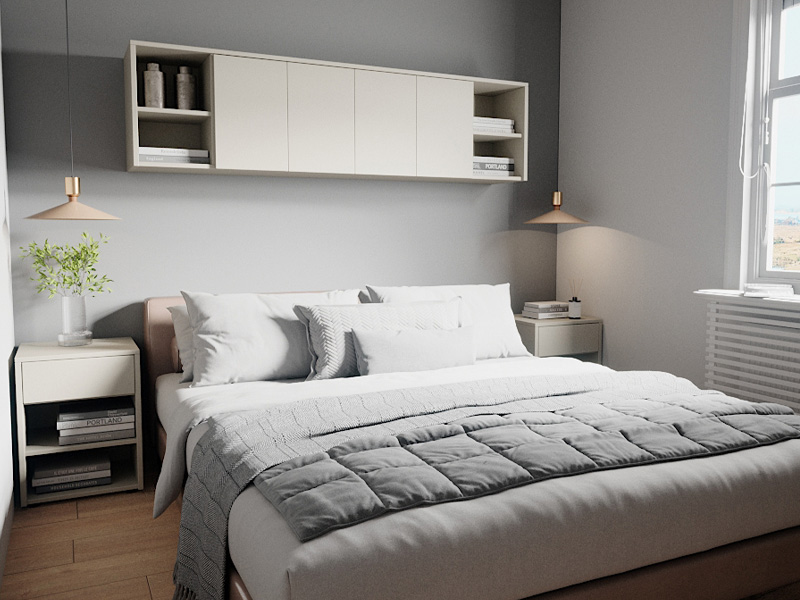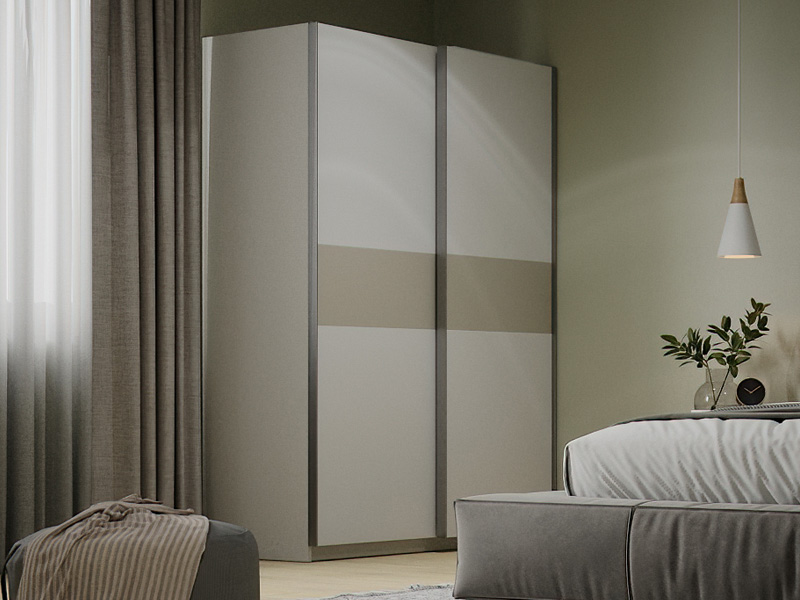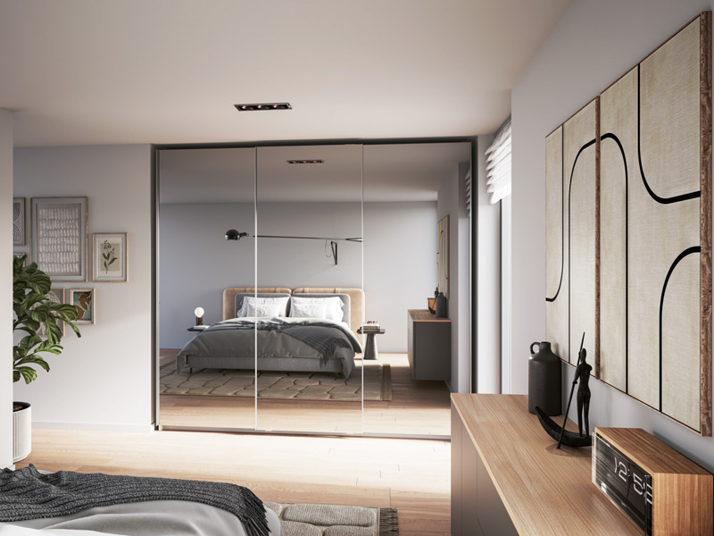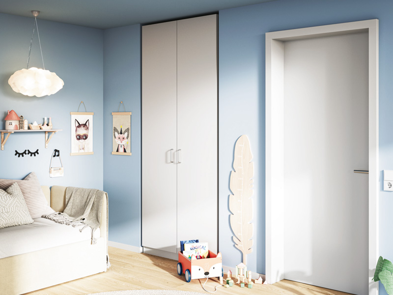 Bei Kleiderschränken oder Regalen sparen Schiebetüren Platz, weil sie nicht in den Raum hineinragen. Wenn möglich, ersetze Flügeltüren durch Schiebetüren, besonders in schmalen Zimmern.
