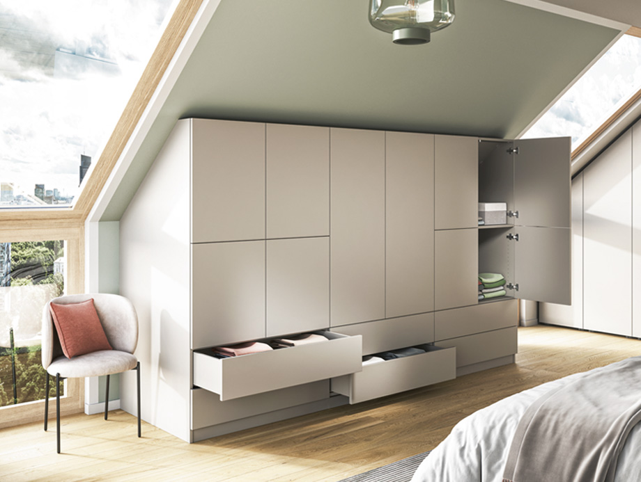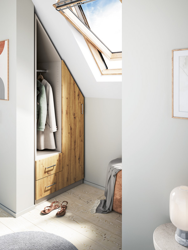 Unter den Dachschrägen schlummert wertvoller Stauraum, den Du mit maßgefertigten Möbeln nutzen kannst. Mess auf jeden Fall den Kniestock und die obere Tiefe (und Breite) aus, um Drempelschränke oder Schränke mit einer rechten und linken Schräge passgenau zu konfigurieren. Schränke oder Regale mit Schräge schmiegen sich exakt entlang der Dachschräge an und nutzen so einen Raum, der andernfalls verschenkt werden würde.