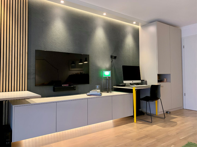 Nischen sind irgendwie nervig, bergen aber große Möglichkeiten, wenn es um cleveren Stauraum geht. Gestalte ein Regal oder Schrank passgenau, sodass er die Nische voll ausfüllt. Schließt das Möbelstück bündig mit der Wand ab, ergibt sich eine harmonische Einheit, die dem kleinen Raum mehr Ruhe verleiht. Beachte, dass Du bei der Konfiguration eine Schattenfuge benötigst. So kannst Du den Einbauschrank komfortabel aufstellen.
