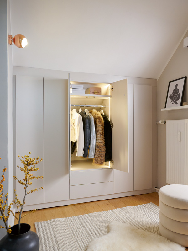 Kleine Räume, aber hohe Wände? Dann nutze die Raumhöhe voll aus, um Stauraum zu gewinnen! Ergänze Deine Schränke z. B. mit einem Aufsatzschrank oder plane Deinen Kleiderschrank von Beginn an deckenhoch. In den oberen Fächern kannst Du ganz bequem saisonale Kleidung, Reisetasche und anderes sperriges Zeug unterbringen, das Du nicht jeden Tag benötigst. Zudem gewinnt Deine Wohnung durch die vertikale Ausrichtung der Möbel an optischer Größe - eine Win-Win-Situation!