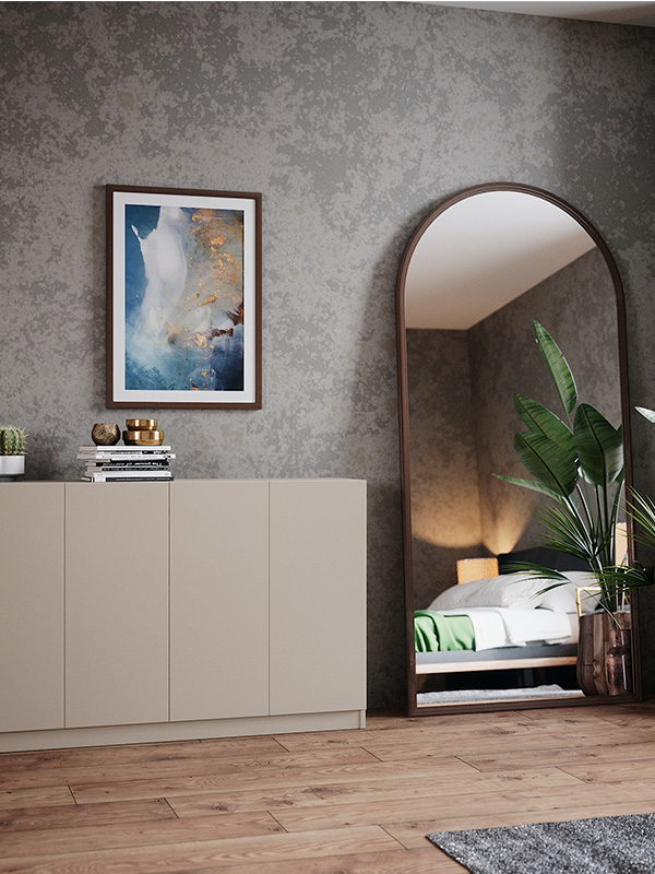 Was kann leere Ecken im Schlafzimmer besser ausfüllen als ein strahlender Ganzkörperspiegel, umrahmt mit großen Leuchten? Im Stile eines Theater- oder Hollywood-Spiegels leuchtet er die Betrachter beim Ankleiden perfekt aus und dient – ganz nebenbei – als romantische und gemütliche Lichtquelle. Lässig aufgestellt auf dem Boden verstärkt sich der Effekt.