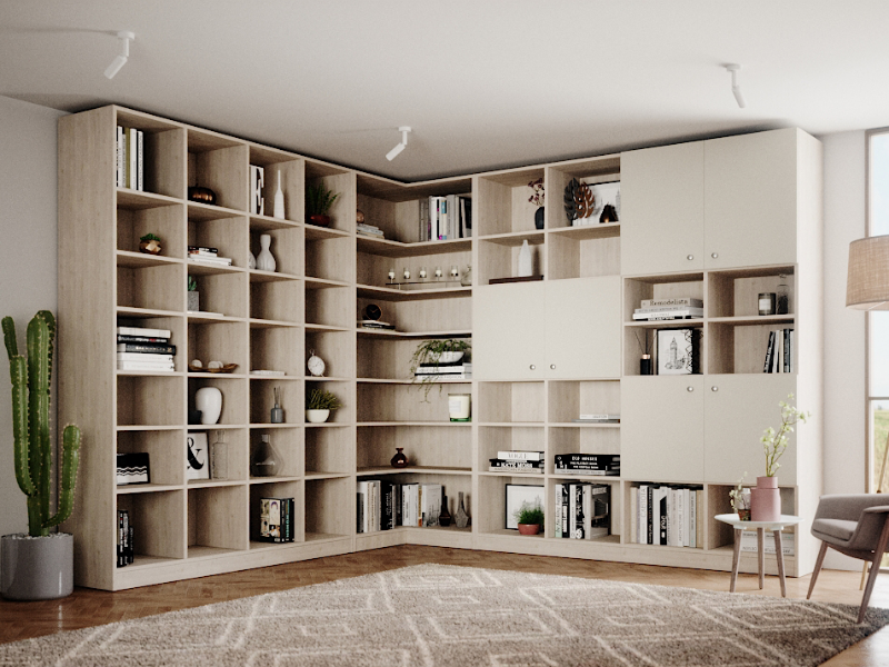 Auch ein Wandvorsprung oder eine Nische kann zur Regalwand umgestaltet werden. Die Möbel können passgenau eingesetzt werden, sodass eine gerade Front zwischen Wand und Regal entsteht. Noch ein Bild oder etwas Dekoration– und schon entsteht ein wunderbares neues Raumkonzept.