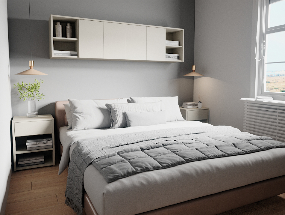Ähnlich dem Platz über der Tür kannst Du den Schlafbereich rund ums Bett für Stauraum nutzen. Hierbei lohnt sich eine Kombination aus Schrankwand und Hängeschränken, um ein bogenförmiges Ensemble als optischen Rahmen über dem Kopfteil des Bettes zu kreieren. In den oberen Schränken kommen z. B. saisonale Bettbezüge, Gästebettzeug oder Taschen und Koffer unter, die Du nur ab und zu brauchst. Alternativ dienen Hängeregale als tolle Möglichkeit, um Zimmerpflanzen in Szene zu setzen, die das Raumklima beim Schlafen verbessern.