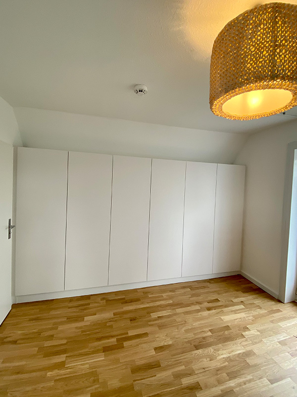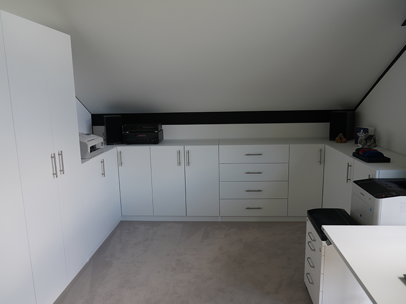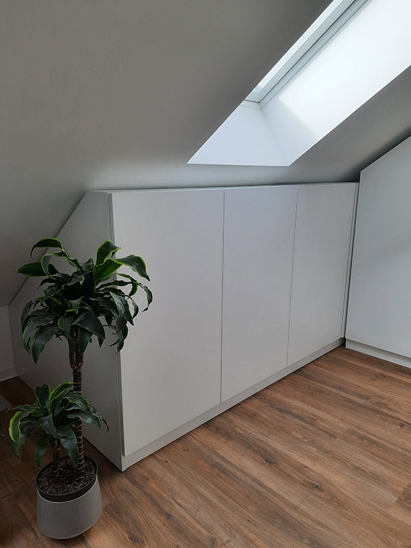 Ein Schrank mit Schräge nutzt jeden verfügbaren Zentimeter an einer Giebelwand oder andere Decke mit Dachschrägen aus, um Stauraum über die gesamte Wandfläche zu schaffen. Oft geht sonst dieser Platz mit geraden Schränken verloren. In unserem Konfigurator kannst Du die Schräge des Schranks passgenau einstellen, sodass Du effizienten Stauraum erhältst und den Raum optimal ausnutzt. Dadurch entstehen einheitliche Möbelkombinationen, die dem Raum Ruhe und Harmonie verleihen - eine gute Lösung für komplexe Kleiderschränke oder eine Bürowand fürs Homeoffice.