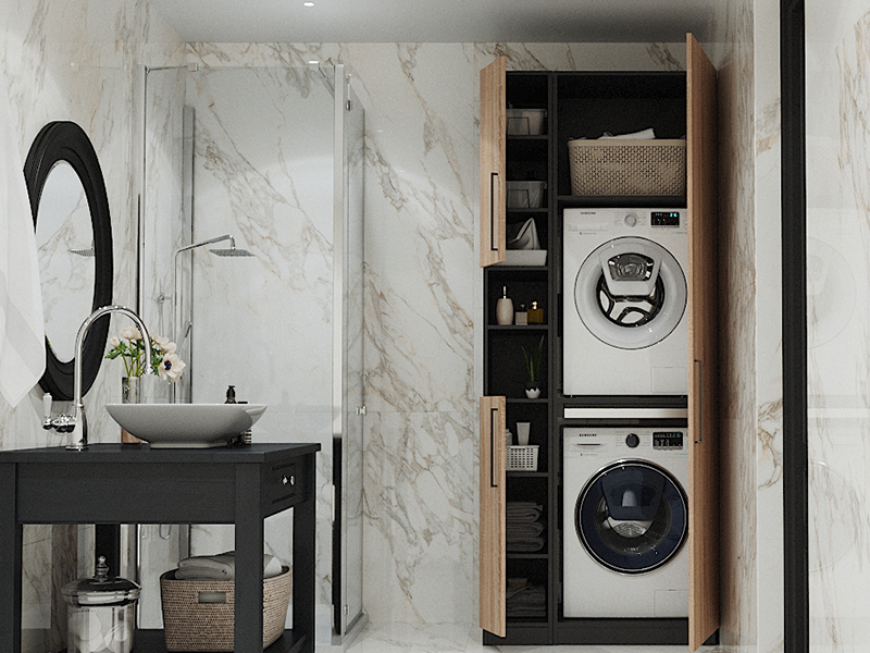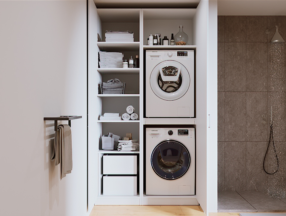Egal ob kleines Bad oder ein schmaler Hauswirtschaftsraum - ein Waschmaschinenschrank bietet cleveren Stauraum für Deine Waschmaschine, Deinen Trockner und alles, was dazu gehört. Dank der stabilen Bauweise unserer Schränke, kannst Du einen Waschmaschinenschrank komplett nach Maß gestalten, damit Waschmaschine und Trockner übereinander platziert werden können. Du nutzt also die Höhe des Raumes aus, um Stellfläche im Bad einzusparen. Noch dazu verbesserst Du den Komfort für die Hausarbeit, da Du dich weniger bücken musst. Unsere Waschmaschinenschränke erhältst Du in kompakten Versionen für ein Gerät oder als Waschturm für zwei Geräte.