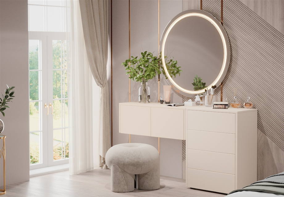 Wenn es um die Gestaltung eines kompletten Schminkbereichs geht, ist es wichtig, die Schminkkommode harmonisch mit anderen Möbelstücken wie einem Schrank und einem Regal zu kombinieren.