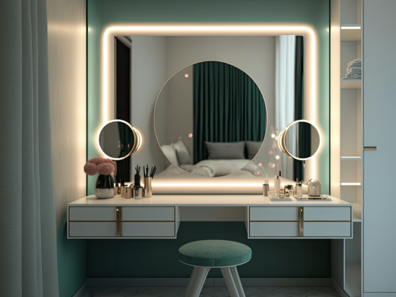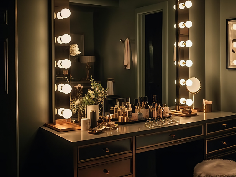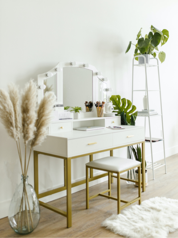 - Durchdachte Beleuchtung: Denke auch an die Beleuchtung der einzelnen Möbelstücke. Sorge dafür, dass Deine Schminkkommode, der Schrank und das Regal ausreichend beleuchtet sind, um eine angenehme und gut sichtbare Umgebung zum Schminken zu schaffen. Kombiniere verschiedene Lichtquellen wie Tischlampen, Deckenleuchten oder LED-Streifen, um den Raum optimal auszuleuchten.