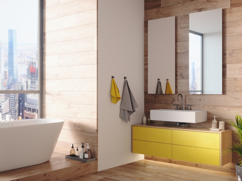 Beim Planen des Möbelstücks lassen sich sowohl Korpus als auch Rahmenfüllungen in diesen Dekoren gestalten. Wer mag, wagt einen Stilmix zwischen Holz und Farbe. Das kann besonders im Bad frisch wirken. Fronten aus Spiegelglas sind beim Schwebetürenschrank praktisch und platzsparend. Kommoden und Highboards lassen sich mit Glasfronten besonders luftig gestalten.