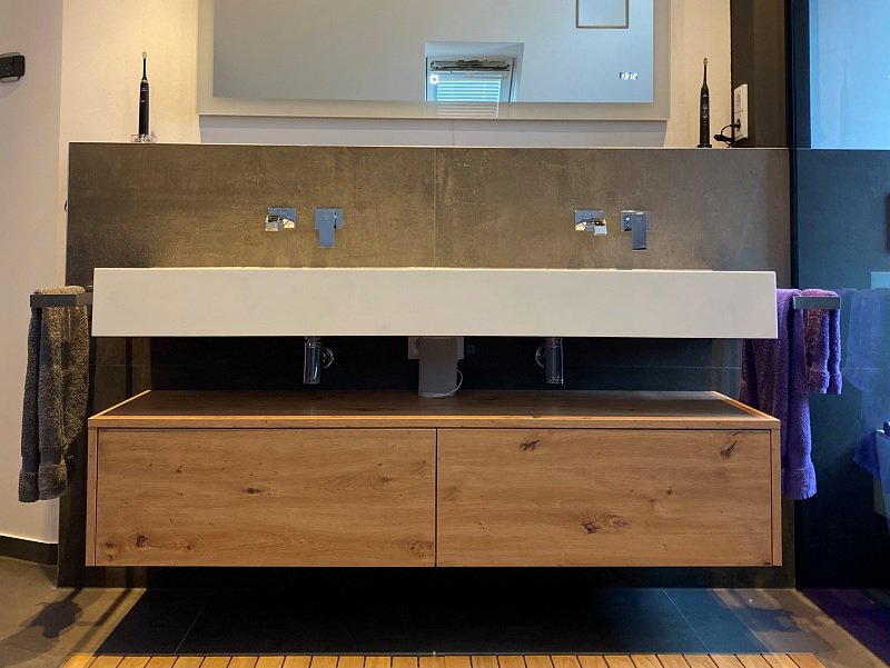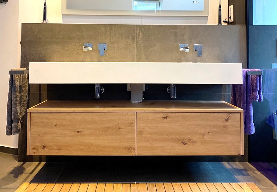 Es kommt hier ein Lowboard zum Einsatz. So entsteht zwischen Unterschrank und Waschbecken ein Freiraum, welcher die Möbel-Kombination überraschend luftig wirken lässt. Vorteil bei Florian B.: Die Siphons der Waschbecken sind sehr flach, sodass sich das Lowboard bequem darunter platzieren lässt.