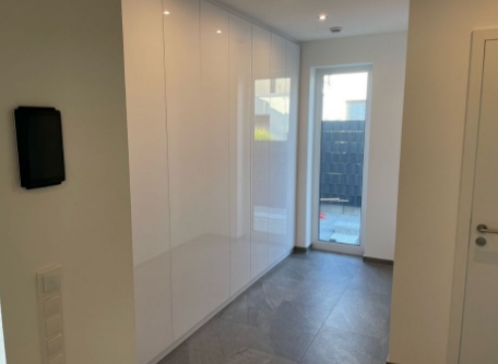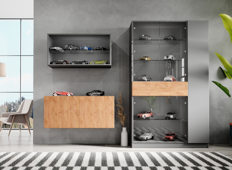 Mit dem Online-Konfigurator konnten die beiden ihren Schrank komplett mit Glastüren und Einlegeböden aus Glas planen. Die neue Wohnung, die Torsten M. und Katrin K. vor kurzem bezogen haben, bietet eine sehr hohe Decke und eine große Wand im Wohn- und Essbereich. Der optimale Platz für die Lucifer-Vitrine. „Wir konnten die Vitrine mit 40 cm so schmal planen, sodass ein leichter Durchgang problemlos möglich war.“