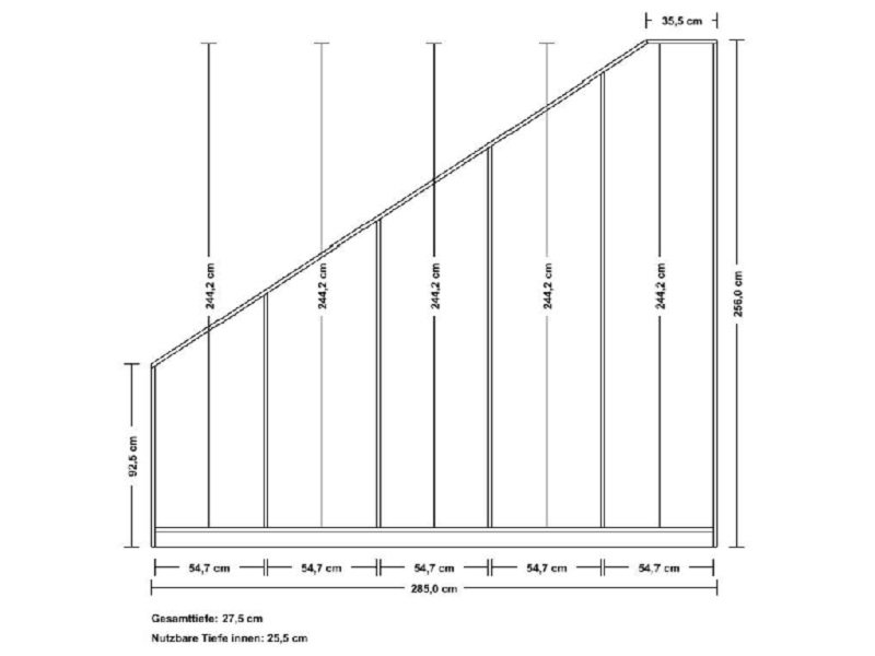 Als drittes Element des Schranksystems hat sich Familie S. für eine großzügige Bücherwand entschieden. Mit einer Länge von 2,85 Metern und einer Tiefe von 27,5 Zentimetern nutzt das Regal dabei die volle Breite der Wand aus. So bietet das Regal ausreichend Platz für verschiedene Büchersammlungen und andere Gegenstände, wie Dekoartikel und Lagerboxen.