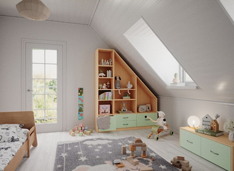 Die Erstausstattung des Kinderzimmers beinhaltet in der Regel ein Babybett, eine Wickelkommode, einen Stillplatz und einen Kleiderschrank. Und wohin mit dem Spielzeug? Auch dafür sollte Platz geschaffen werden. Da im Zimmer Schrägen vorhanden sind, mussten diese natürlich bei der Planung berücksichtigt werden.