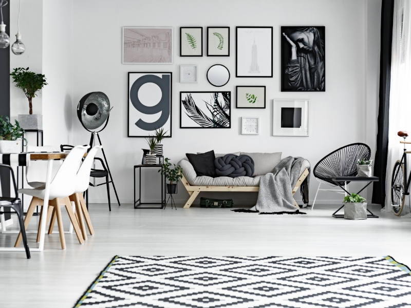 Zu einer schwarzen Einrichtung gehören auch die passenden Accessoires. Wenngleich nicht die gesamte Einrichtung ausschließlich aus schwarzen Möbeln bestehen darf, so sollte der dunkle Farbton immer wieder auftauchen, um ein schlüssiges Konzept durchzuziehen. Verwende schwarze Rahmen für Drucke und Grafiken, Fotos und Spiegel. Die Rahmen unterstreichen die geometrische Form der Objekte. Diese grafischen Details sind modern und betonen den klaren und geordneten Look der Wohnung. Ebenso bieten sich schwarze Deko-Figuren, Tischlampen mit schwarzem Gestell oder Vasen an.