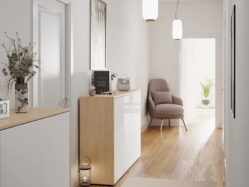 Tipp: Für den Flur kannst Du das Lowboard mit einem hohen und schmalen Garderobenschrank kombinieren. Das Board bietet dann flexiblen Platz für Schuhe und eine Sitzgelegenheit.