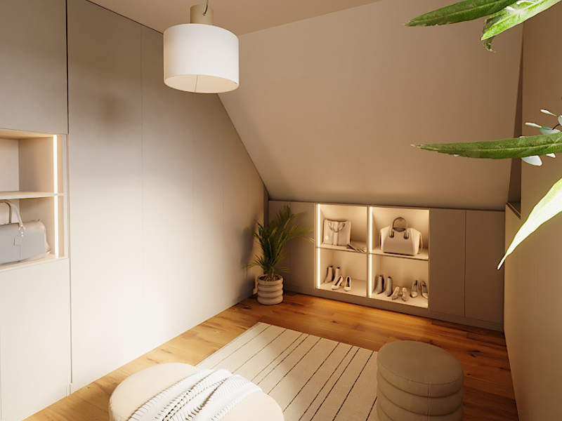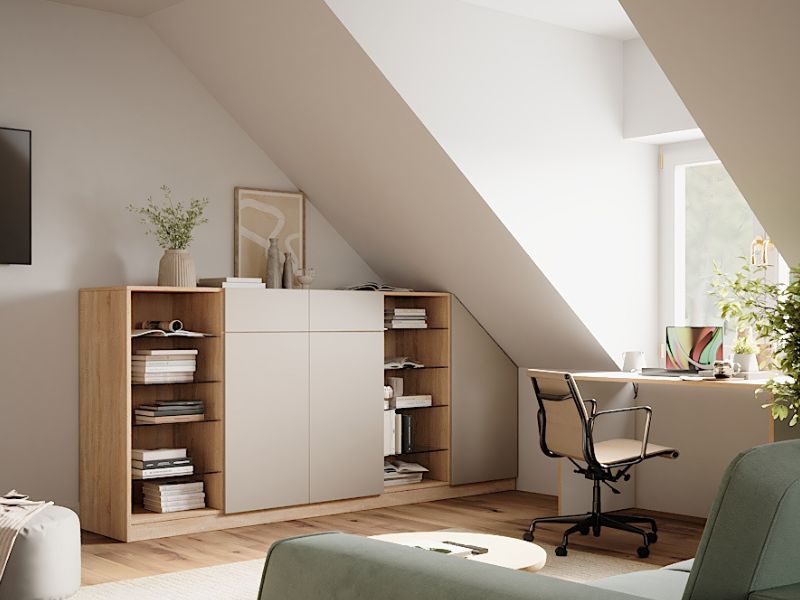 Nutze den Platz unter der Dachschräge oder unter einer Treppe optimal aus. Du kannst die Schräge seitlich (links und rechts) oder hinten planen. Alles, was Du bei der Konfiguration brauchst, ist die Höhe des Kniestocks, damit das Board später maßgenau passt. Wähle dafür als Grundmodell einen Schrank mit Schräge und passe alle Maße flexibel an.