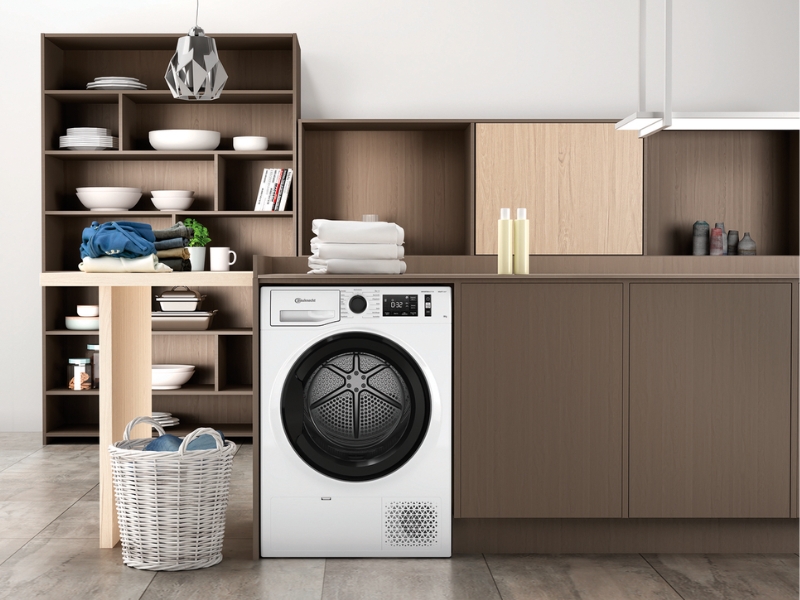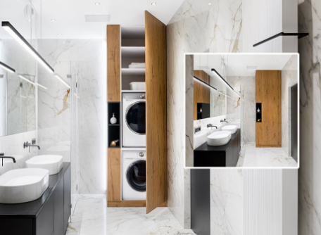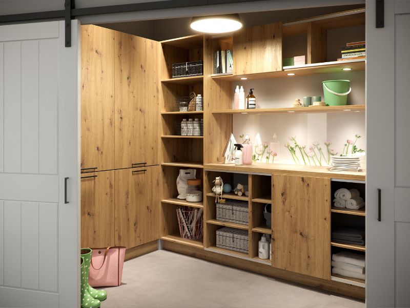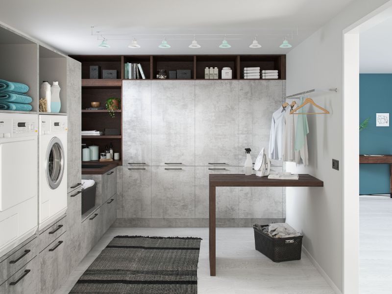 Tipp: In kleinen Waschküchen zählt jeder Zentimeter. Plane z. B. einen Eckschrank, der „tote“ Ecken vermeidet, effizient und platzsparend ist.