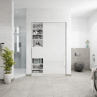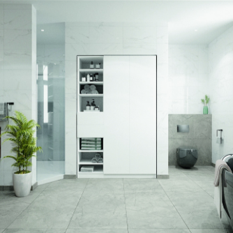 Der praktische Helfer für Badezimmer mit Schrägen: Passend zu einem Bad zum Wohlfühlen sind Kniestockregale mit offenen Fächern. Hier können Kosmetik, Hygieneartikel und Handtücher untergebracht werden und sind sofort griffbereit. Wir empfehlen einen weißen Korpus, den Du nach eigenem Geschmack mit farbigen Schubladenfronten veredeln kannst, z. B. in einem Trüffelbraun oder einem Holzton. Unsere Dekorplatten sind mit einem Kunstharz beschichtet. Dieses ist äußerst robust und verträgt Feuchtigkeit sehr gut. Auch die Reinigung von Kalkrückständen und Wasser ist spielend leicht möglich.