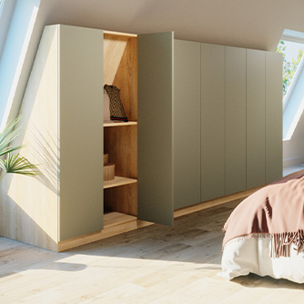 Bei uns planst und konfigurierst Du Möbel nach Maß ganz einfach online. Auch deinen neuen Dachschrägenschrank gestaltest Du vollkommen individuell nach deinen Wünschen – auf dem Tablet von der Couch aus oder auf dem Desktop. Das funktioniert über unseren Konfigurator, der Dich Schritt für Schritt durch den Prozess leitet. Alle Maße für das Möbelstück, wie z.B. die Drempelhöhe, kannst Du beliebig anpassen. Über das 3D-Modell des Schranks fügst Du Ausstattung und Dekor intuitiv per Drag-and-Drop hinzu.