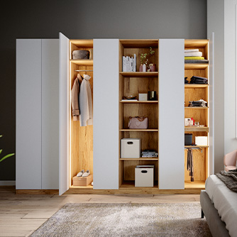 Wähle im Konfigurator dann die passende Ausstattung: Für Kleiderschränke bieten wir komfortable Elemente wie Hosenauszüge, einen platzsparenden Kleiderlift, Schubladen und kleine Auszüge für Krawatten und Gürtel.